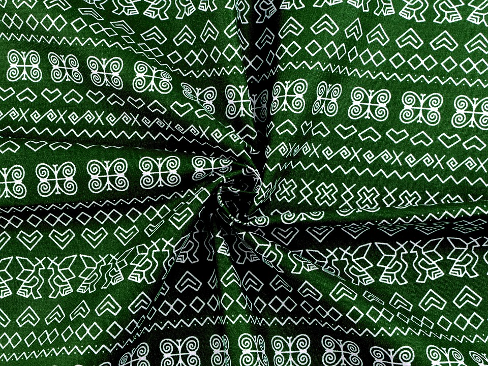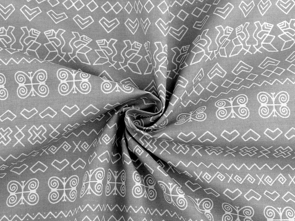 Bumbac imprimat cu motive folclorice.Tesatura este potrivita pentru realizarea de perne, de asternuturi, de fete de masa, de perdele etc..Pretul afisat este pentru un metru liniar.