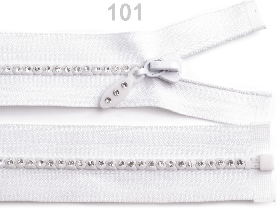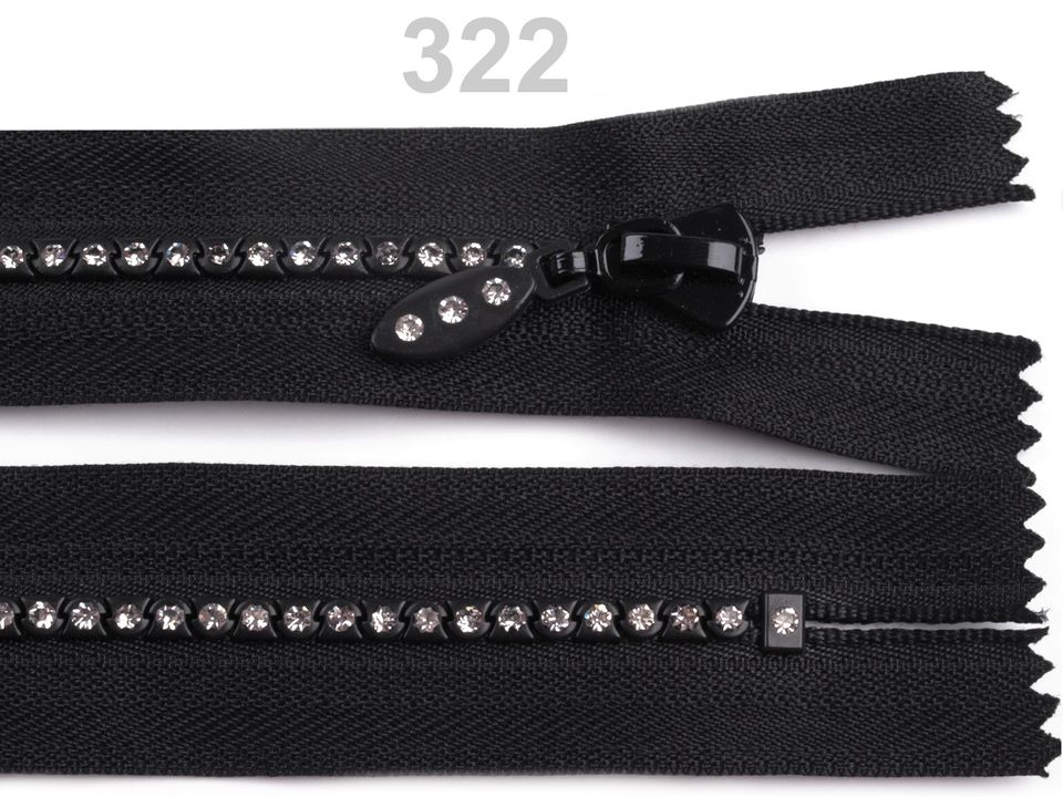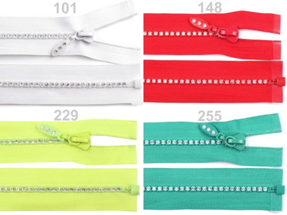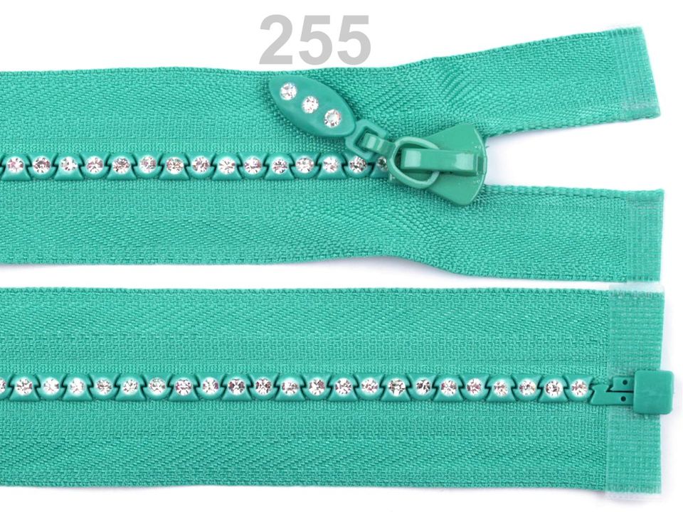Fermoar din plastic împodobit cu pietre. Prezinta deschidere. Se foloseste pentru a coase jachete, pulovere, pulovere etc