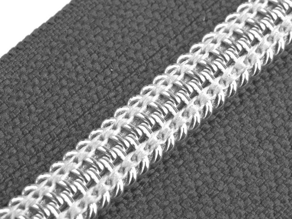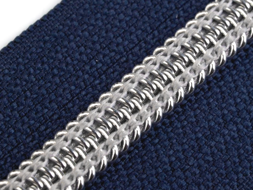 Fermoarul din nylon are dinți argintii. Îl poți folosi ca fermoar pentru jachete, jachete scurte, pulovere și genți sport. Fermoarul este deschis.