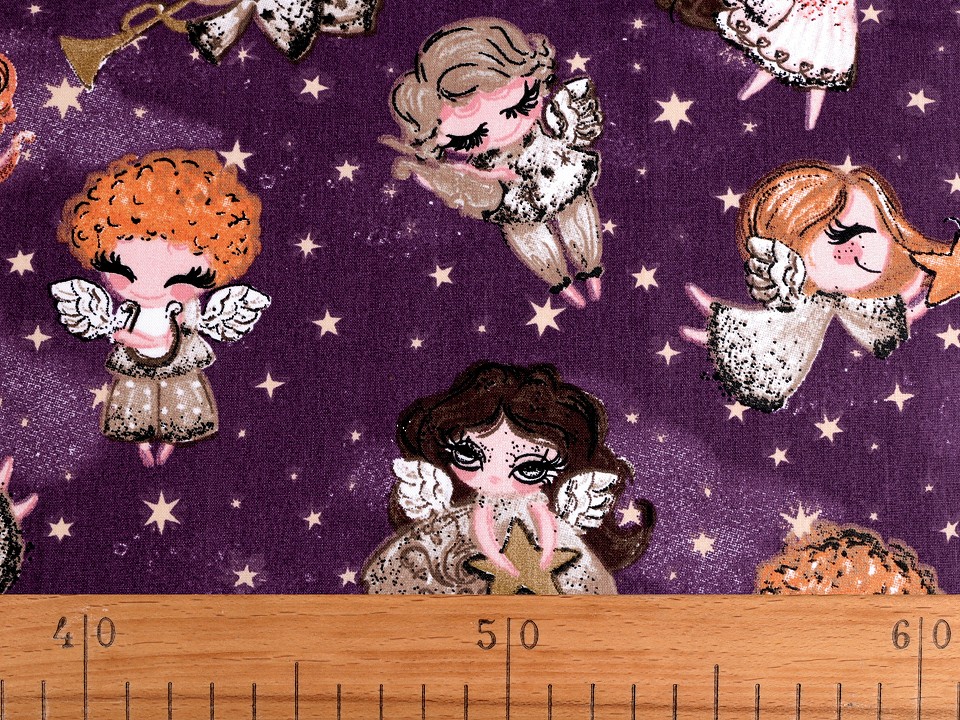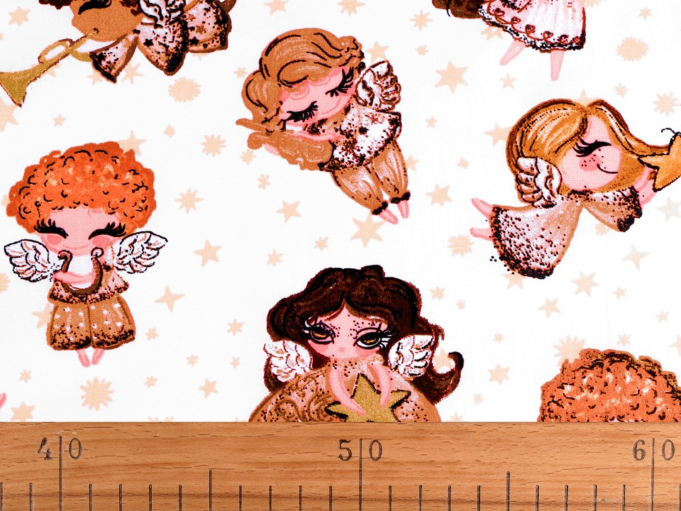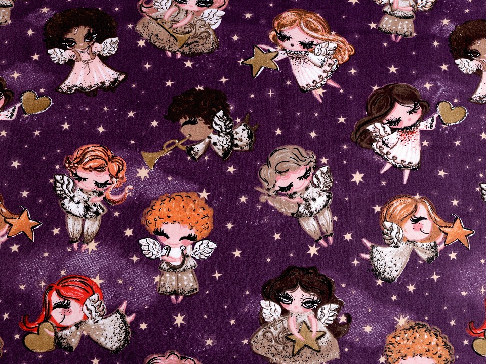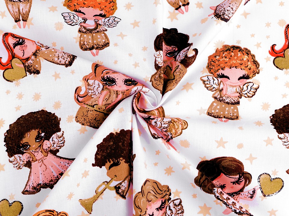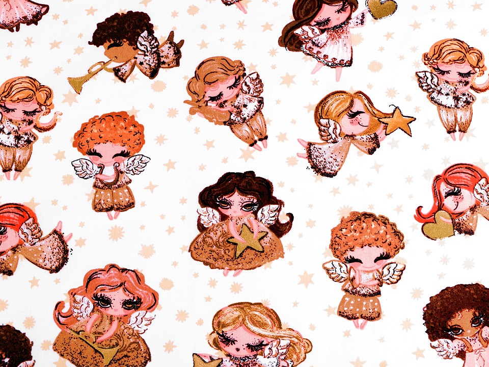 Material bumbac imprimat cu ingerasi potrivit pentru realizarea decoratiunilor de Craciun, a pernelor, a ceasafurilor, a fetelor de masa, a patuturilor pentru copii etc..Pretul afisat este pentru un metru liniar.