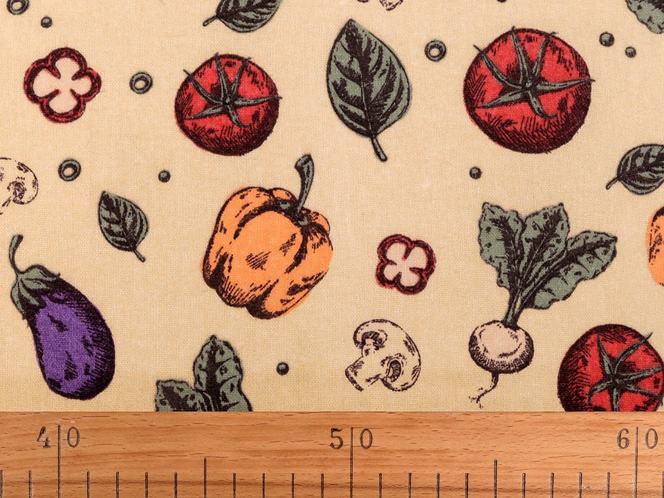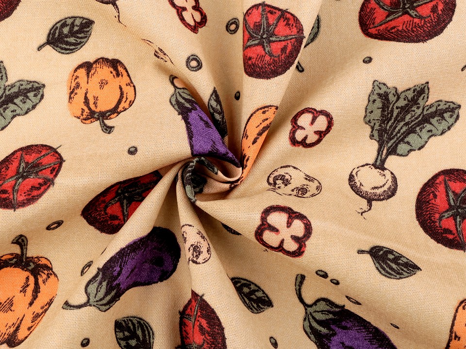 Material din bumbac cu legume potrivit pentru confectionarea de diferite decoratiuni interioare, pentru cusut etc..Pretul afisat este pentru un metru liniar.