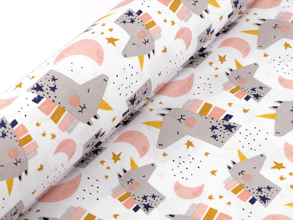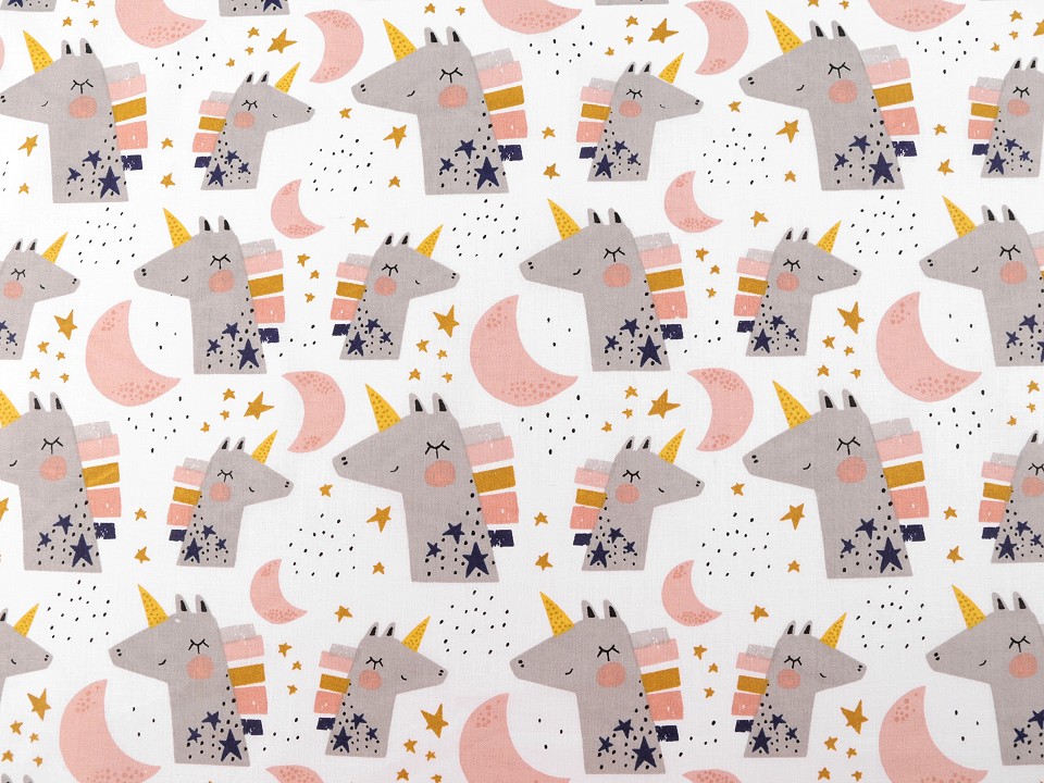 Material din bumbac cu unicorn potrivit pentru a realiza diverse decoratiuni interioare etc..Pretul afisat este pentru un metru liniar.
