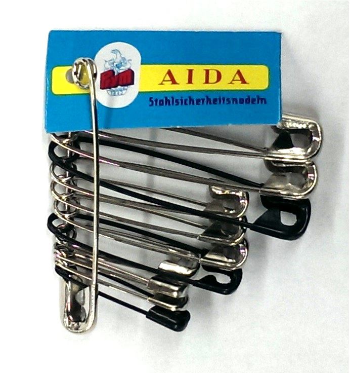Set 12 ace de siguranta argintii/negre. Acul este prevazut cu o inchizatoare care ii acopera varful, pentru a evita intepatura sau pentru a impiedica desprinderea din locul unde este prins. Dimensiuni: 27/38/50 mm. Calitate deosebita oferita de PRYM Germania. Pretul se refera la un singur produs ce contine 12 buc .