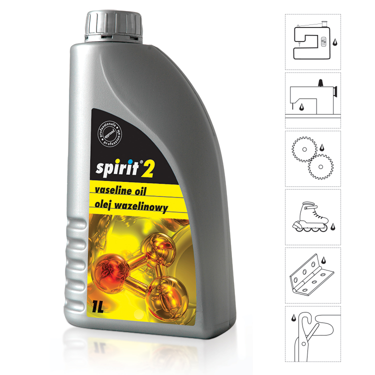 SPIRIT 2 - 1L ULEI TIP VASELINA PENTRU MASINI DE CUSUT Spirit 2 este un ulei tip vaselina , universal, netoxic, nepatabil, fara miros si fara culoare utilizat pentru lubrefierea mecanismemlor de precizie. Recomandat in special pentru lubrefierea pieselor masinilor de cusut, tricotat si a altora utilizate in industria textila. Neutru la materiale plastice. Recomandat ca agent care faciliteaza alunecarea si protectia fata de lipirea de produse din plastic si guma la sabloane.