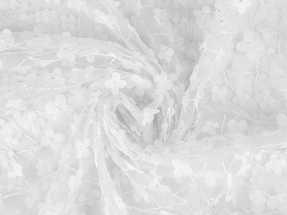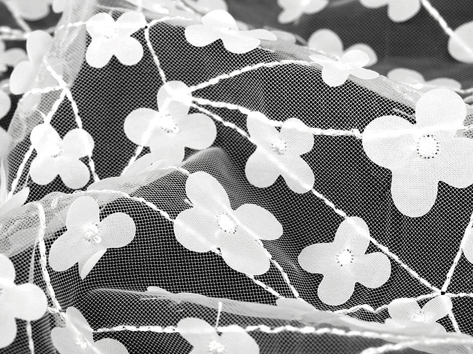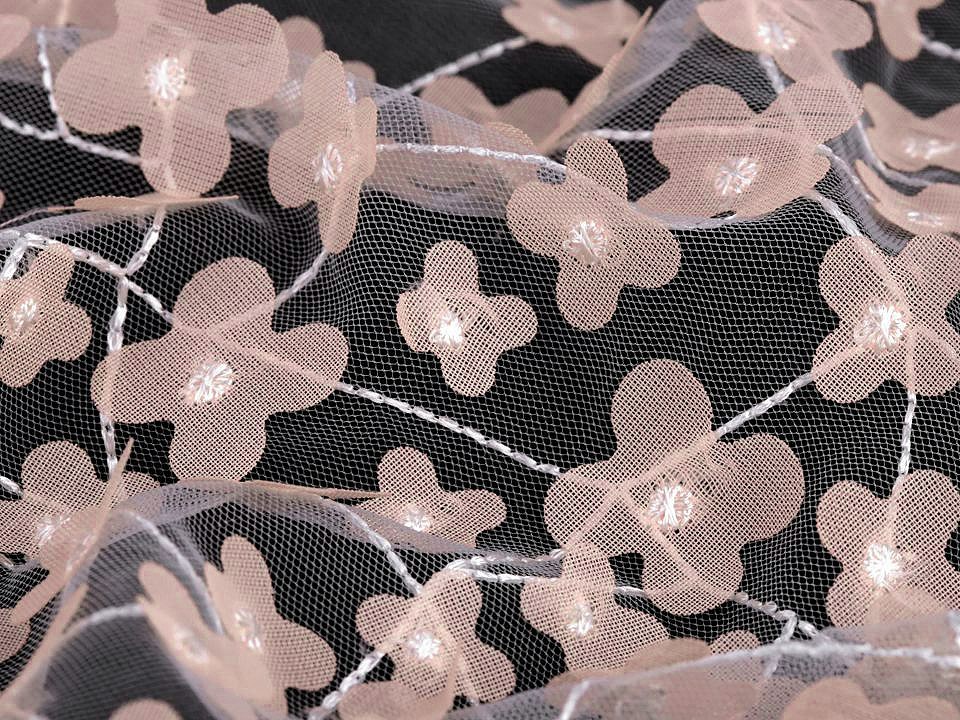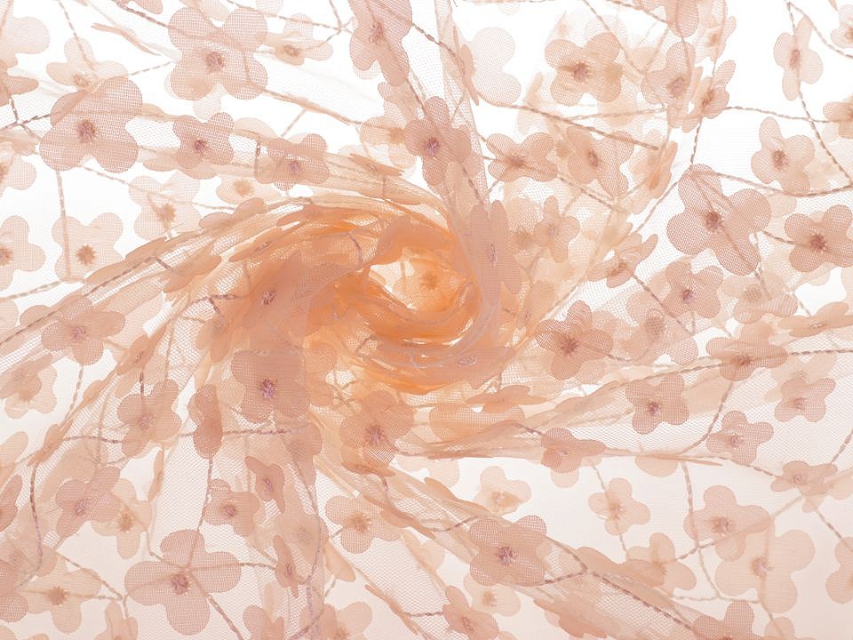 Tul fin cu flori brodate.Acest material poate fi folosit pentru a confectiona fuste, bluze, rochii de mireasa, rochii de domnisoara de onoare etc..Pretul afisat este pentru un metru liniar.